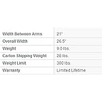 Width Between Arms: 21"; Arm Height: 25.5"; Weight Capacity: 300 lbs