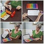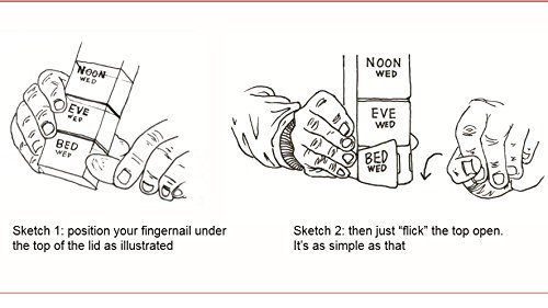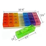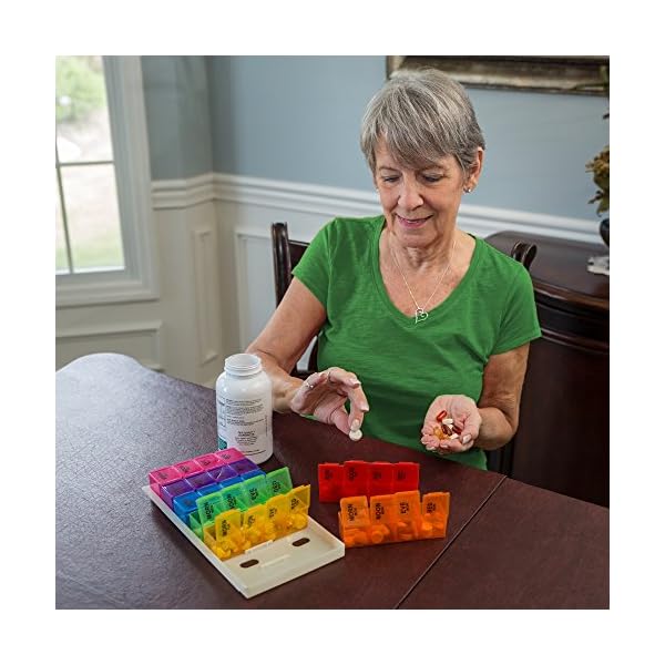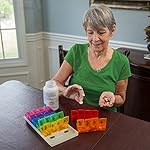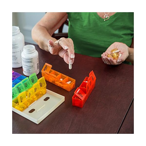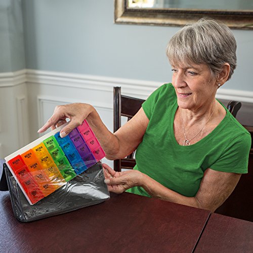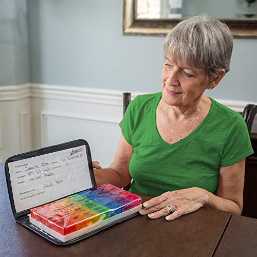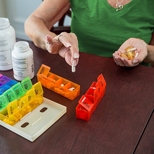 This 7-day, rainbow color-coded organizer lets you set up medication a week in advance, taking the guesswork out of what pills to take when. Unlike most pill holders, we've even included separate compartments for different times of day, AM and PM. These "buckets" open with ease (great for seniors with arthritis) and hold up to several pills at once.