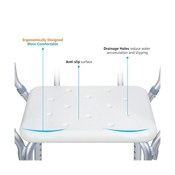 Ergonomically Designed-Our Bath Chair is contoured seat and backrest are padded with a waterproof foam for superior comfort. Drainage holes reduce slipping or sliding on pooled water, creating a safe and comfortable shower seat.