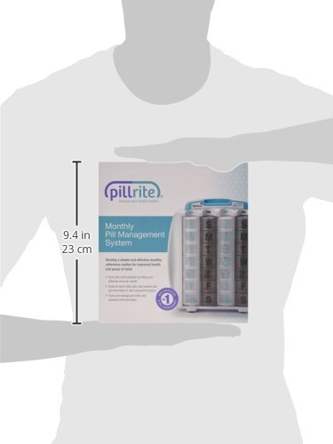 SPECIFICATIONS of the PILLRITE: 4.2 x 8.2 x 9 inches; UV protected to safeguard your medicine/supplements; 4 AM and 4 PM pill boxes for 4 weeks; 1 compact caddy with notepad and 6 sets of colored refill reminder strips.