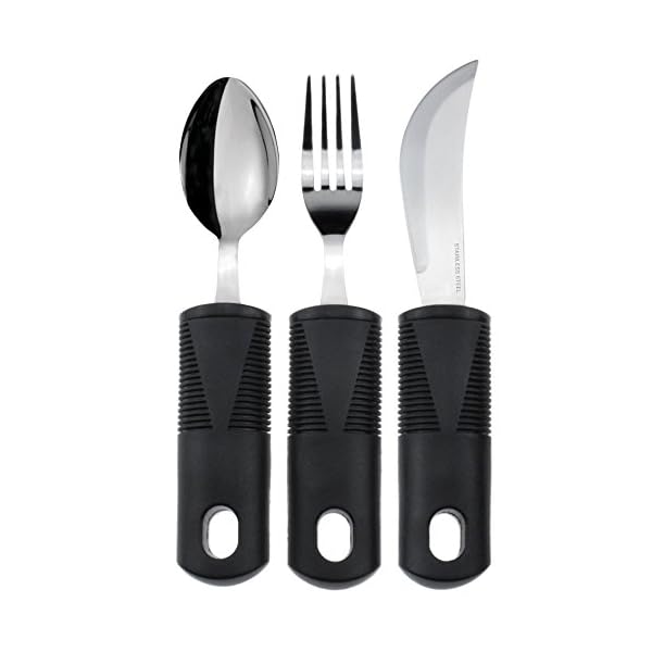 – SUITABLE THREE PIECE ADAPTIVE UTENSIL SET: This (3) Three – Piece Adaptive Utensil Set offers you a traditional set of (1) One Fork, (1) One Tablespoon, and (1) One knife.