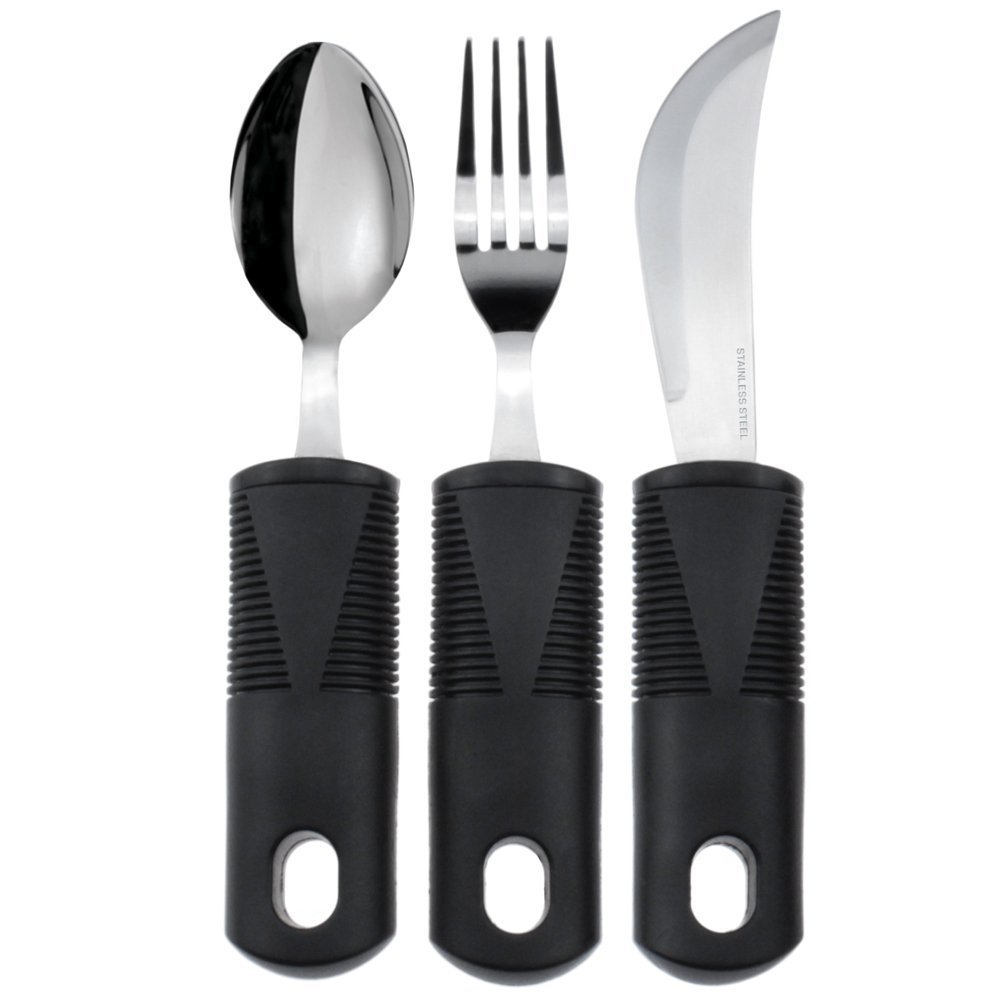 - HIGH QUALITY ASSISTED EATING AID: EATING INDEPENDENTLY CAN BE CHALLENGING FOR Neurological conditions such as Parkinson's Disease, Polyneuropathy, Stroke, Multiple Sclerosis, and Traumatic Brain Injury that may cause various types of involuntary Hand Tremors, Movements, Tingling, and/or Hand Numbness. Arthritis may cause painful hand inflammation and stiffness of the joints. This (3) Three - Piece Adaptive Utensil Set will allow difficult meal times to become easier and more enjoyable.